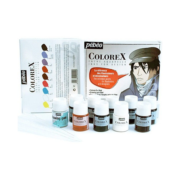 Ce Coffret d’encre Aquarelle Colorex Illustration comprend 8 flacons d’encre aquarelle Colorex 20ml (jaune primaire, blanc, cyan, magenta, sépia, sanguine, violet, bleu cobalt), 1 flacon 20ml de drawing gum, 1 flacon 20ml d’encre de chine et 3 pipettes en plastique.