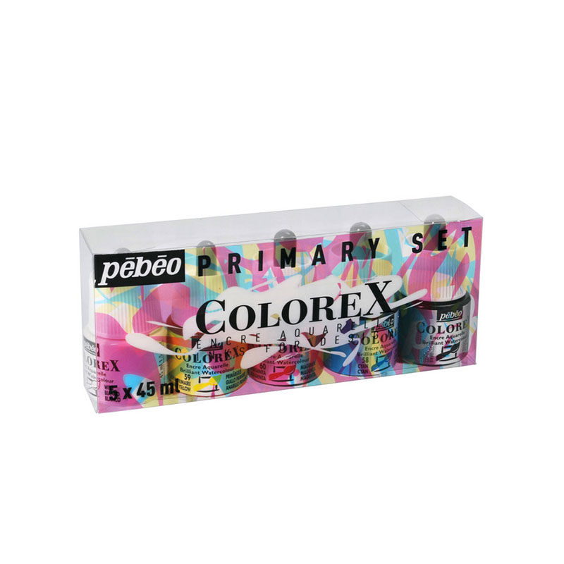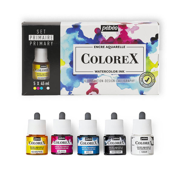 Pébéo propose un assortiment contenant 5 flacons de 45 ml d’encre Colorex contenant les couleurs primaires : cyan, magenta, jaune, ainsi que le noir et blanc.