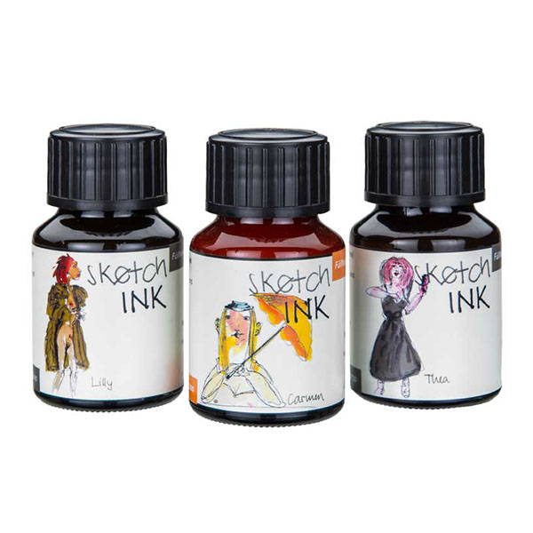 SketchINK® est une gamme d’encre composée de 10 couleurs. Ce grand choix de nuances permet un vaste champ d’application : ainsi, sketchINK® peut être utilisée autant au stylo-plume qu’à la plume ou au pinceau. Un autre trait caractéristique de cette encre consiste en sa résistance à la lumière et à l’eau. Des pigments particulièrement fins permettent un écoulement optimal de l’encre. Cela rend cette gamme parfaitement appropriée au dessin à contours fins. Les lignes sèchent déjà après très peu de temps et peuvent être repeintes. En surface, sketchINK® se mélange avec de l’eau pour créer de brillants effets. Elle est donc l’accompagnement idéal pour l’ «Urban Sketcher». Designers, graphistes et architectes apprécieront également cette encre.