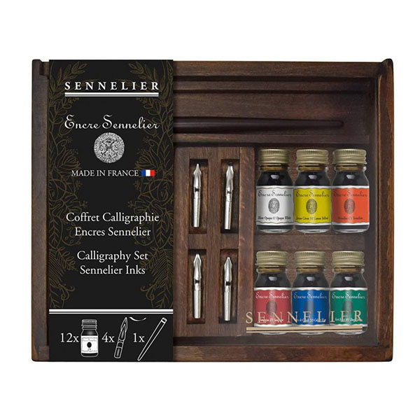La Maison Sennelier propose un joli Coffret calligraphie en bois de 12 flacons d’encres gomme laque de 10ml. Son couvercle transparent coulisse. Nous découvrons ainsi les 12 flacons bien rangés sur les côtés, un porte-plume et 4 plumes de calligraphie de différentes largeurs.