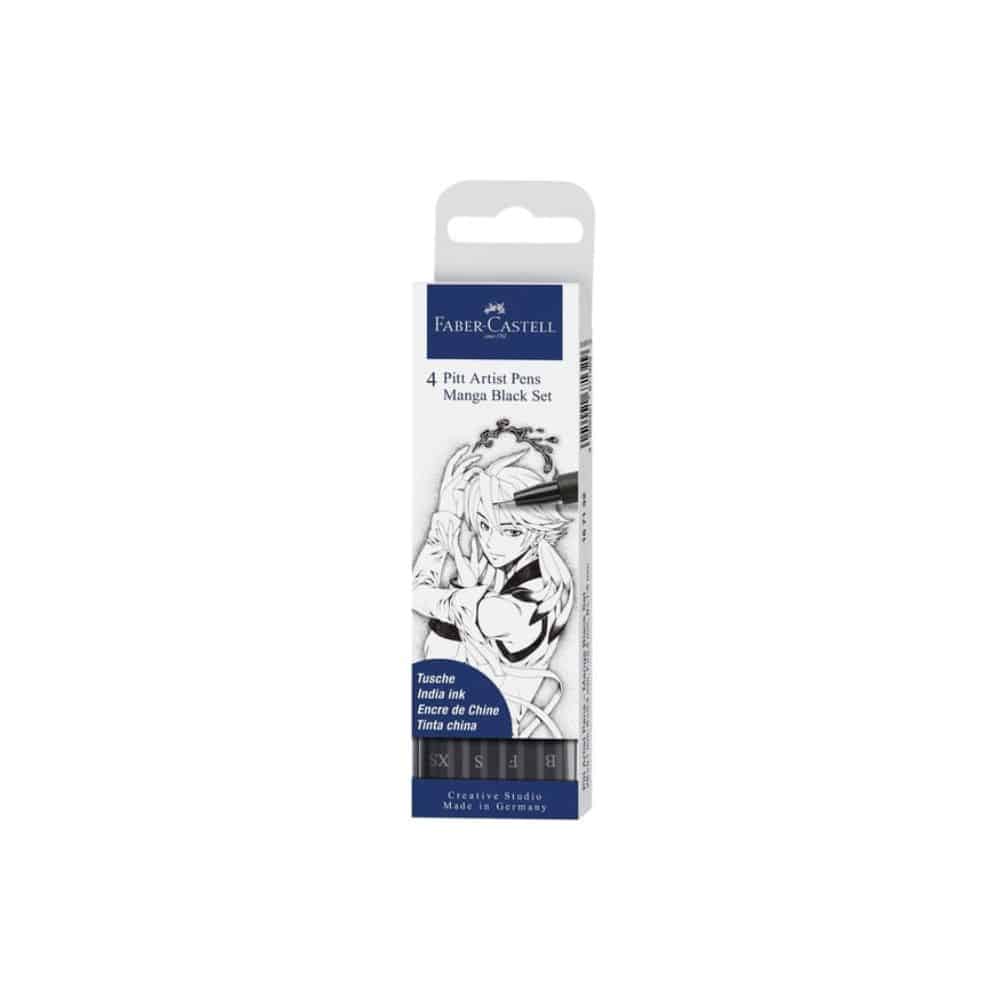Ce set contient 4 Pitt Artist Pen Noir : XS = 0,1 mm, S = 0,3 mm, F = 0,5 mm, B = pointe de pinceau.