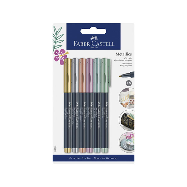 Le Set de 6 Feutres métalliques Créatifs FABER CASTELL convient à toutes surfaces. Cet assortiment de 6 couleurs chatoyantes peut s’utiliser sur papier, carton, verre, porcelaine, plastique, métal, pierre.