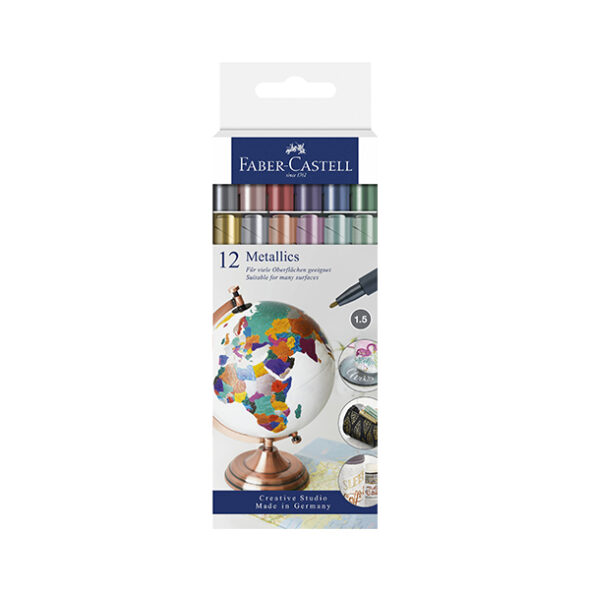 Les Feutres métalliques créatifs Faber Castell sont parfaites pour toutes surfaces, y compris papiers clairs ou foncés, plastique, aluminium, porcelaine, verre et métal, avec un effet métallique de qualité. Résistant aux taches et éclaboussures d’eau après séchage, les métaux peuvent devenir imperméables (non lavables au lave-vaisselle) à 160°C pendant 30 minutes. L’encre métallique à base d’eau est inodore, ne traverse pas le papier, et s’applique uniformément via un embout en fibre de 1,5 mm, sans nécessiter de manipulation préalable.