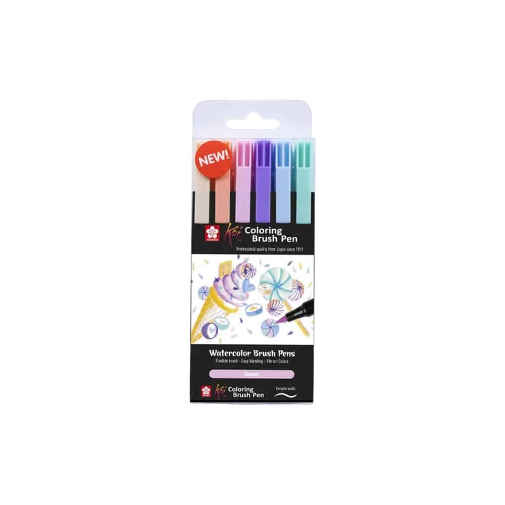 Ce Set de 6 feutres Koï contient les nuances suivantes : Jaune de Naples, Rouge corail, Lilas, Lavande, Bleu ciel clair, Vert perroquet.