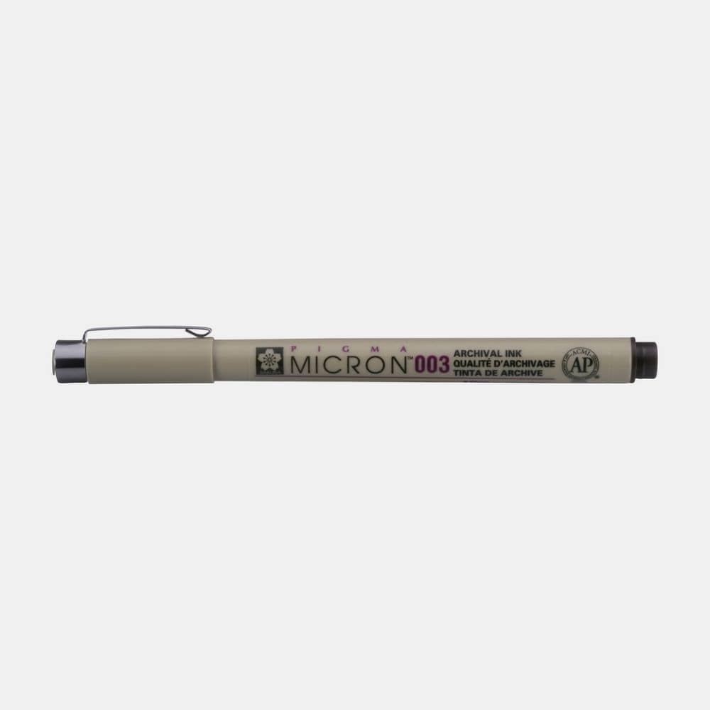 Marqueur technique fineliner calibré avec encre Pigma, composée de pigments et d’eau : le Feutre Pigma Micron 003 SAKURA, d’une pointe de 0.15mm.