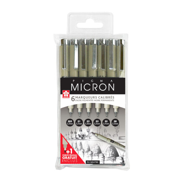 Les Feutres PIGMA MICRON de la maison SAKURA sont idéals pour l’esquisse, les contours, le graphisme et les décors. Il convient également pour la reproduction et le tirage de plans. L’encre pigmentée de haute qualité à base d’eau au PH neutre permet à l’artiste un travail de précision. Cette encre sèche instantanément, ne fuse pas, ne traverse pas le papier, elle est également permanente et résistante à l’eau, à la lumière et aux solvants. Ils disposent d’un canon en acier renforcé afin protéger la pointe calibrée en fibres de carbone ultra-compactes.