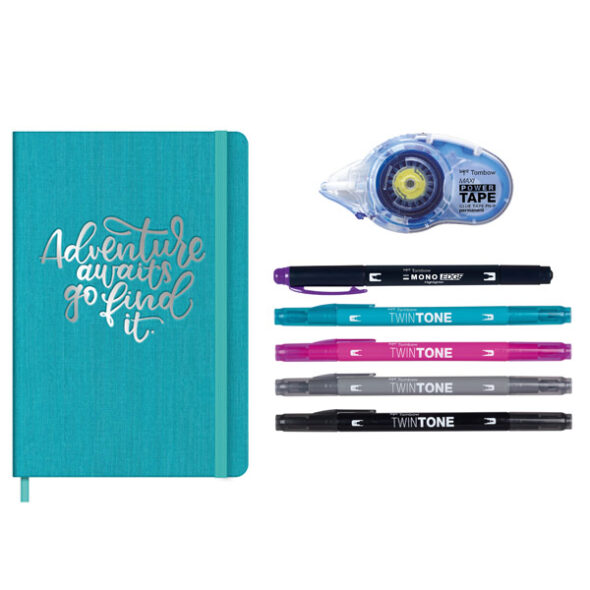Ce Set Journal de voyage Tombow contient tous les matériaux nécessaires à la conception d’un journal de voyage.