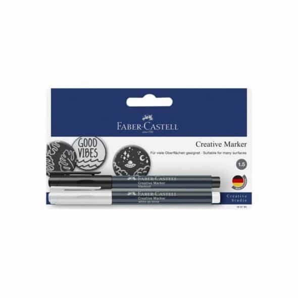 Le Set de 2 marqueurs créatifs Faber Castell réunit un marqueur noir et un marqueur blanc spécialement développés pour les artistes, illustrateurs et créatifs qui aiment expérimenter sur différents supports. Leur encre est formulée pour bien adhérer sur des surfaces variées, qu’il s’agisse de papier, carton, bois, métal, plastique ou autres matériaux lisses, ce qui en fait des outils polyvalents pour des projets de dessin, de lettrage, de customisation ou de loisirs créatifs.