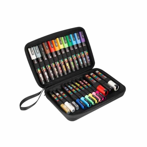 La Mallette POSCA présente une palette de 24 teintes éclatantes et profondes, parfaitement adaptées à divers supports comme le papier, le textile et le verre.