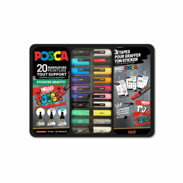 Cette mallette spéciale “stickers graffiti” Posca est parfaite pour apprendre à créer des stickers. L’ensemble contient non seulement les marqueurs, mais également une explication détaillée pour apprendre à dessiner des stickers à travers des exercices étape par étape.