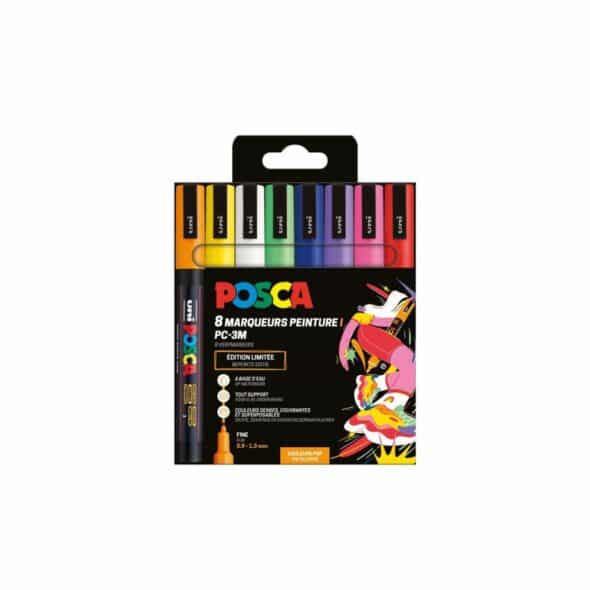 Le Set POSCA PC‑3M Pop Colours POSCA propose huit teintes vives — orange, jaune, blanc, vert clair, bleu foncé, violet, rose et rouge — parfaites pour les projets créatifs et professionnels. Avec une pointe fine de 0,9 à 1,3 mm, ces marqueurs offrent une précision appréciée en lettrage, illustration, esquisse, ou customisation d’objets.