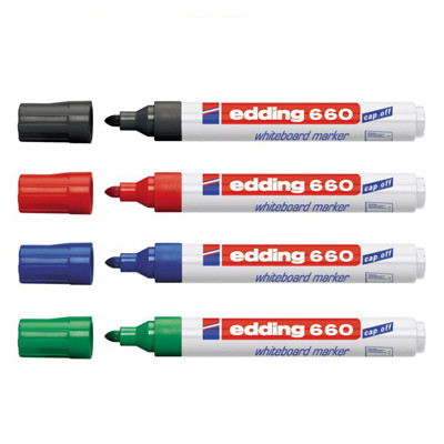 La Pochette de marqueurs Edding sont des marqueurs avec un corps plastique à pointe ogive (de 1,5 à 3 mm) pour tableaux blancs, effaçable à sec. Grâce à l’encre cap-off, il peut rester décapuchonné plusieurs jours sans sécher ! Pratique lorsqu’on oublie son marqueur ouvert en salle de réunion! L’écriture s’efface à sec sur presque toutes les surfaces non poreuses comme l’émail et la mélamine. L’encre résiste à la lumière et sèche rapidement.