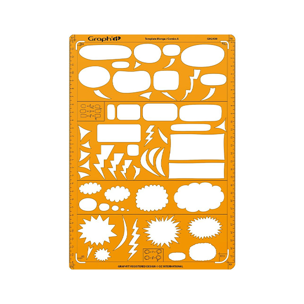 Le Trace Bulle Comics Manga A de GRAPH’IT est une plaque rectangulaire A4 avec formes évidées pour tracer proprement les bulles de bande dessinée décrivant dialogues ou pensées des personnages.