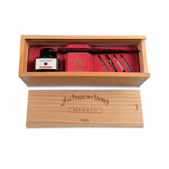 Le Coffret de calligraphie Perle Noire de la marque HERBIN se présente sous la forme d’un élégant plumier en pin et inclut un fascicule retraçant l’histoire de l’encre Herbin. Il renferme un porte-plume en bois vernis, cinq plumes d’écriture, ainsi qu’un flacon de 30 ml d’encre Perle Noire, la couleur d’encre la plus ancienne commercialisée par Herbin.