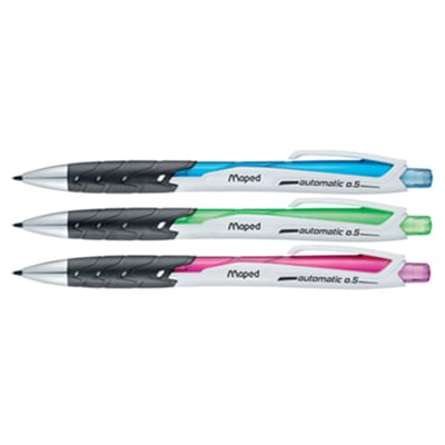 Le Porte-mines Black’Peps automatic de MAPED est idéal pour les élèves et étudiants. Grâce à son mécanisme qui permet l’avancée permanente de la mine, les mines cassent moins. Vous pouvez désormais écrire en continu sans interruption. Il n’est plus nécessaire d’appuyer. Ce porte-mines se compose d’une pointe métallique, d’une zone de préhension douce et ergonomique avec clip et gomme.
