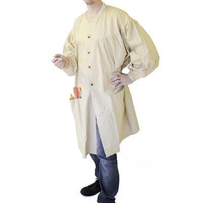 Taille unique, avec fermeture facilitée par des boutons à l’ancienne. Poches larges compartimentées, pour pinceaux ou crayons. Coupe large qui facilite les mouvements. Sangle porte chiffon pour nettoyer mains ou pinceaux. Emmanchures élastiques qui se remontent facilement.