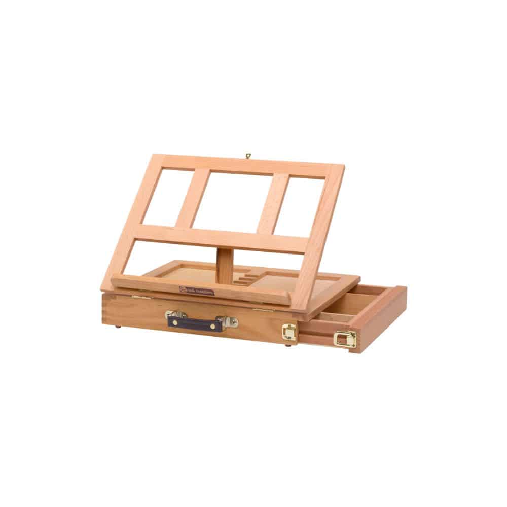 Le Chevalet Coffret de Table Callisto ART CREATION, en bois de hêtre, combine robustesse et praticité. Son tiroir intégré, muni de compartiments en bois, offre un rangement soigné pour le matériel artistique. Compact et doté d’un support escamotable, il se transporte facilement, idéal pour les artistes travaillant en atelier ou en déplacement. Avec sa conception soignée et ses dimensions parfaitement adaptées, il permet de réaliser des œuvres en toute simplicité tout en offrant une grande stabilité et une esthétique élégante.