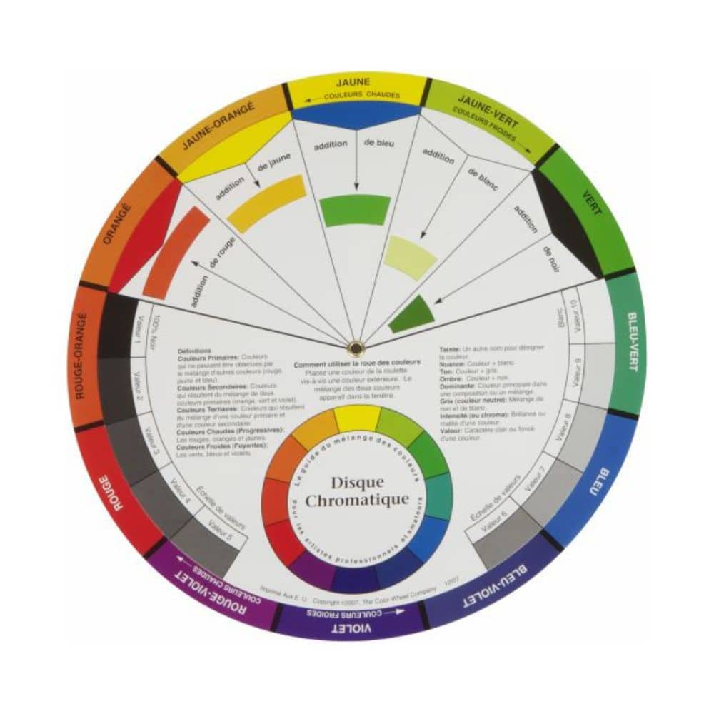 Disque chromatique idéal pour l’apprentissage de couleurs et la réalisation des mélanges. Double face, verso avec dégradé de couleur.