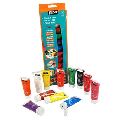 Ce coffret contient 12 couleurs vives et couvrantes : noir, blanc, sienne, vert, violet, bleu, rose, fuchsia, rouge, orange, jaune clair et jaune foncé.