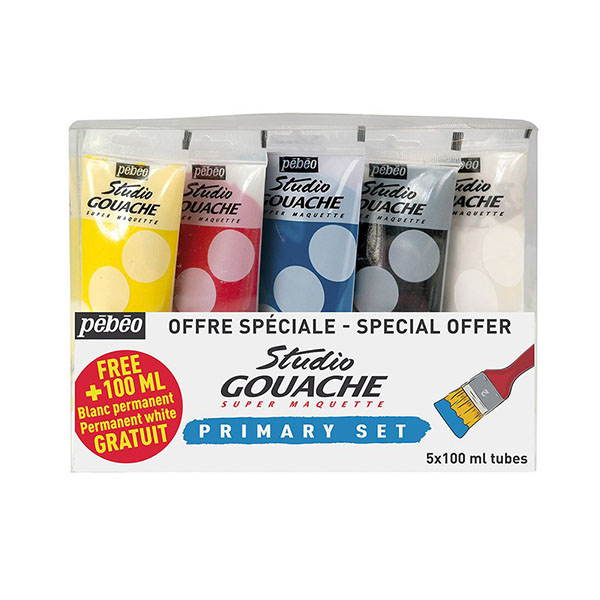 Le Set de 5 tubes de gouache de 100 ml est composé des couleurs primaires (Jaune primaire, cyan, magenta primaire), noir d’ivoire et blanc permanent.