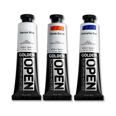 SGOLDEN propose une gamme de peinture acrylique innovante : la Gamme OPEN. Elle offre un large éventail de 80 couleurs et permet à l’artiste temps de travail de 5 à 10 fois supérieur aux acryliques traditionnelles. D’une texture onctueuse, Open convient à la fois aux mordus d’acrylique mais aussi aux peintres à l’huile, qui découvriront une peinture plus facile à maîtriser.