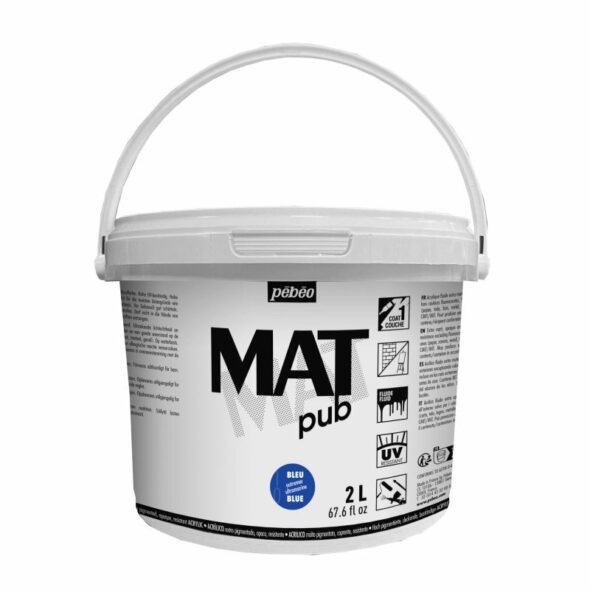 Mat Pub de PEBEO est une peinture acrylique de qualité extra-fine très couvrante et pigmentée offrant un grand confort d’application. Elle donne un rendu lisse et homogène sans traces de pinceau et sans reprise. Les couleurs s’appliquent et résistent sur la plupart des supports mêmes extrêmes, propres ou correctement préparés.