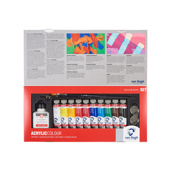 Les couleurs acryliques Van Gogh sont fabriquées avec des pigments de haute qualité selon de rigoureuses normes de qualité néerlandaises. La peinture peut être utilisée directement à partir du tube métallique ou diluée avec de l’eau. En raison du temps de séchage court, il est facile de peindre rapidement couche sur couche. La peinture onctueuse a une charge en pigments élevée pour des couleurs fortes et intenses. Elle peut être appliquée au pinceau d’artiste ou au couteau à palette. Ces peintures de qualité étudiant-artiste ont de bons (25-100 ans dans des conditions de musée) à excellents (plus de 100 ans dans des conditions de musée) degrés de résistance à la lumière.