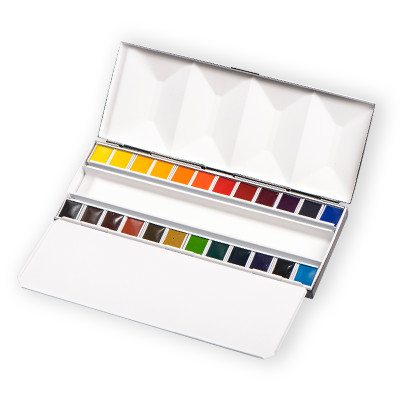 La Boîte métal émaillée est disponible en 24 demi-godets d’aquarelle extra-fine. L’émaillage au four de la boîte lui garantit une longévité exceptionnelle.