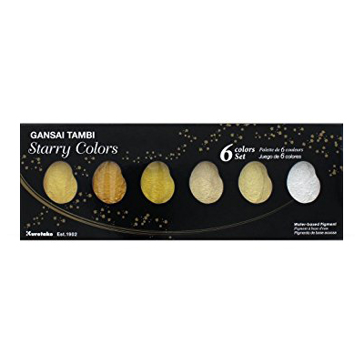 Ce Set 6 Aquarelle Gansai Tambi “Starry Colors” est composé de couleurs aux beaux reflets nacrés pour vous illustrations, vos calligraphies. Ils sont compatibles avec les autres couleurs de la gamme Kuretake Gambi. Ce set contient 6 godets géants de 4.5cm x 2.5cm avec les couleurs suivantes : N°901 Or bleu, N°902 Or rouge, N°903 Or jaune, N°904 Or champagne, N°905 Or clair et N°906 Or blanc.