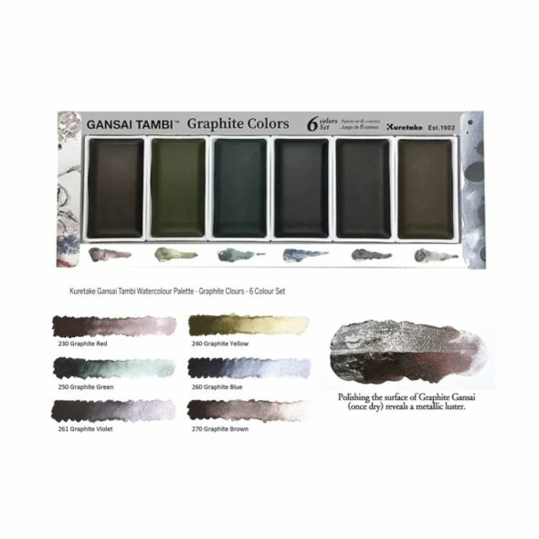 Les teintes de cette palette Graphite présentent des nuances profondes et douces, caractérisées par une texture mate spécifique au graphite. Leur intensité varie en fonction de la dilution avec de l’eau, allant d’une tonalité plus claire à une teinte plus sombre. Après séchage, le polissage de la surface des couleurs Graphite Gansai révèle un magnifique éclat métallique.