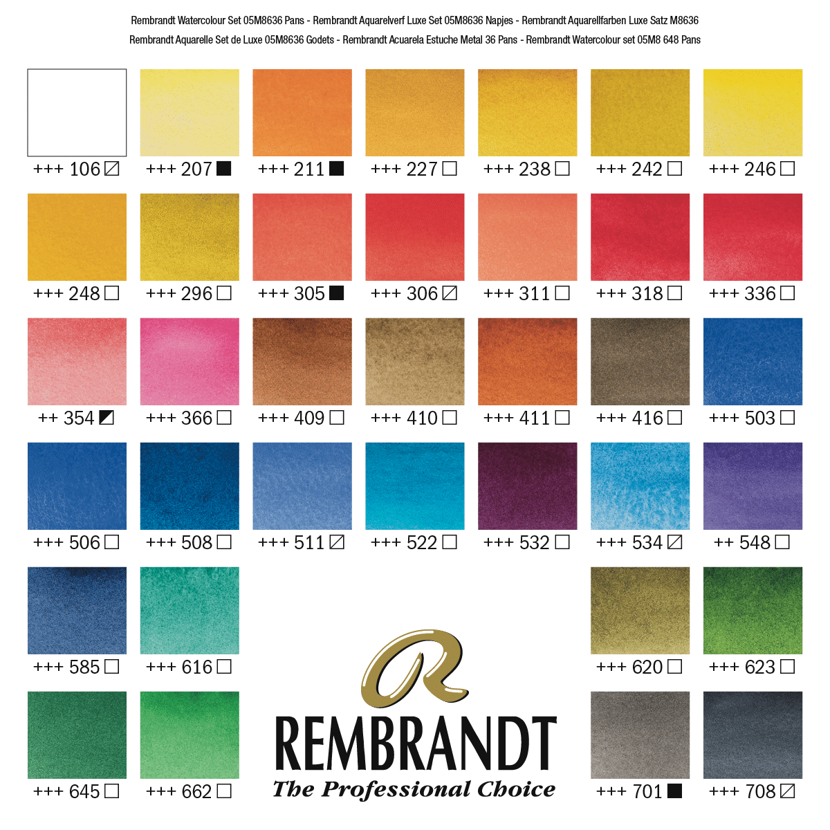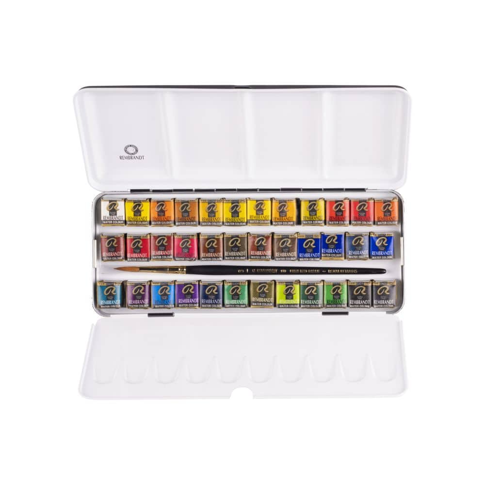 La Boîte luxueuse comprend un assortiment de 36 demi-godets Rembrandt et 1 pinceau Rembrandt série 110 n°6.