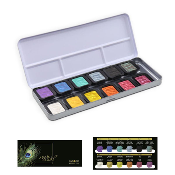 La Boîte de 12 aquarelles métalliques – Arc-en-ciel FINETEC contient les couleurs suivantes : Améthyste, Bleu saphir, Vert mer Caraïbe, Bleu argenté, Noir profond, Couleur mystique, Perle argéntée, Perle doréee, Cristal dorée, Orange cuivré, Rouge et Pourpre.