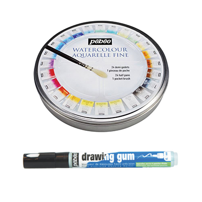 De plus, un Marqueur Drawing gum 0,7 mm vous est offert. Ce marqueur haute précision permet d’effectuer des zone de réserve sur l’oeuvre à l’aquarelle, encore ou gouache diluées. La mèche remplaçable plastique 0.7 mm ne casse pas. Elle permet des applications fines et nettes en continu, dessins, finitions, écritures, effets… Pour entretenir la mèche, elle peut être retirée et nettoyée avec de l’eau.