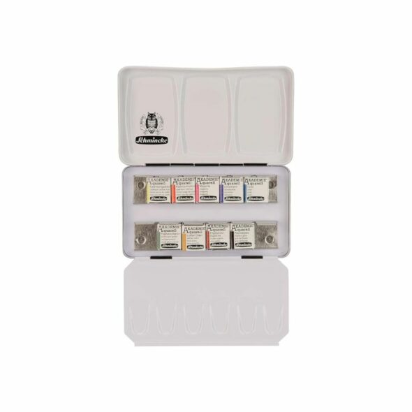 La petite boîte en métal se compose de 9 demi-godets d’aquarelle de grande qualité, à forte concentration en pigments et dotée d’un liant permettant l’adhérence optimale des pigments sur le papier et donc une peinture agréable et facile. Ainsi vos peintures à l’aquarelle seront superbes. Après séchage sur la palette l’aquarelle peut être réactivée sans problème !