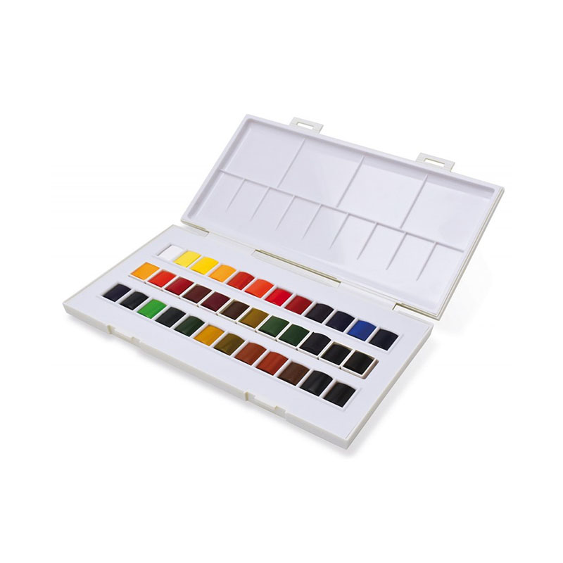 Le Avec Coffret de 36 1/2 godets la Petite Aquarelle contient les couleurs suivantes : blanc de titane, jaune citron, jaune primaire, jaune foncé, jaune orange, orange vif, rouge primaire, rose permanent, violet rouge, bleu outremer, bleu de cobalt imitation, bleu turquoise, bleu primaire, vert intense, vert Jaune, vert sapin, vert olive, ocre jaune, terre ombre naturelle, terre de sienne brûlée, ocre rouge, terre ombre brûlée, gris de Payne, noir d’Ivoire, bleu de Prusse, bleu d’indanthrène, brun Van Dyck, jaune cadmium orangé, laque jaune, laque écarlate, carmin, fuchsia quinacridone, vert de Hooker, vert de vessie, pourpre dioxazine et violet de mars.