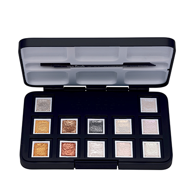 Les couleurs des 12 demi-godets sont : Argent, Or clair, Or foncé, Cuivre, Bronze, Graphite, Blanc interférence, Jaune interférence, Rouge interférence, Bleu interférence, Violet interférence et Vert interférence.