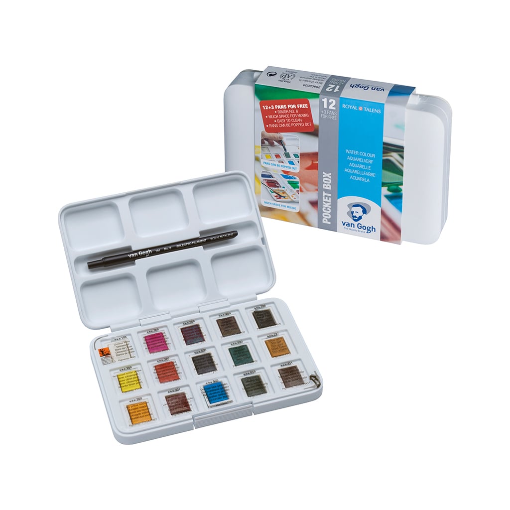 La Pocket Box Aquarelle de Van Gogh contient 12 demi-godets d’aquarelle fine et 3 demi-godets offerts. D’un très bon rapport qualité-prix, les couleurs de cette gamme offre une excellente résistance à la lumière ainsi qu’une longue préservation des couleurs, même après de fortes dilutions.