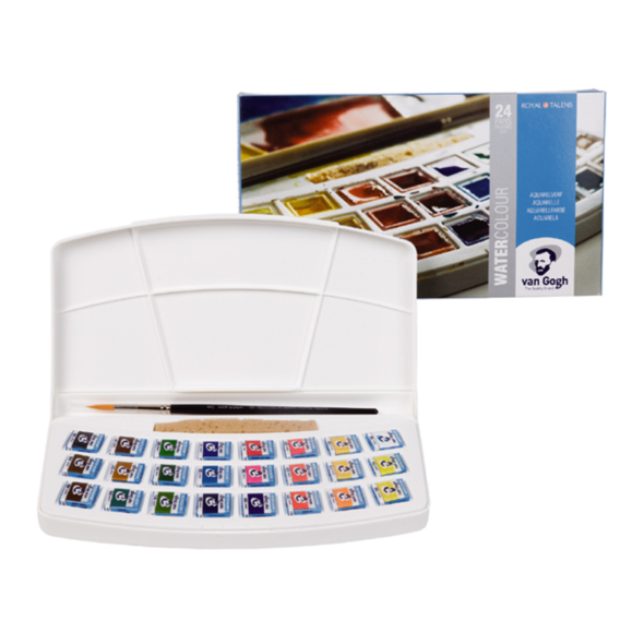 Ce Set aquarelle VAN GOGH, pratique en plastique, a une grande palette pour faire des mélanges et contient 24 demi-godets, une éponges et un pinceau.