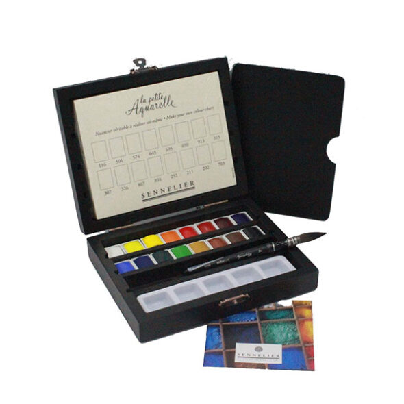 Le Coffret en bois noir de 16 1/2 godets la Petite Aquarelle est accompagné d’un nuancier à réaliser soi même, un pinceau réservoir et bloc de papier.