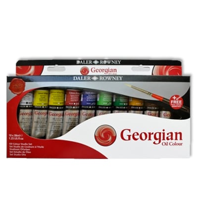 Le Set de 10 tubes d’huile Georgian avec un pinceau offert permet à l’artiste de se consacrer pleinement à son oeuvre, elle ne requière que peu de médium à peindre et s’utilise donc librement dès la sortie du tube. Le set contient 10 tubes de 38ml : Blanc de Titane, Jaune citron, Jaune de cadmium clair, Cramoisi d’Alizarine, Outremer Français, Vert clair permanent, Vert Véronèse (imit.), Ocre Jaune, Terre de Sienne brûlée et Noir d’Ivoire.
