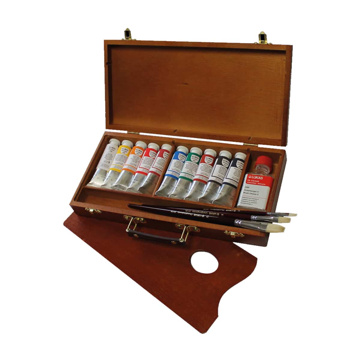 Ce coffret en bois teinté noyer allie élégance, praticité et qualité professionnelle. Conçu en hêtre massif, il offre un espace de rangement soigné et fonctionnel pour accueillir tout le nécessaire à la peinture à l’huile. Il contient une sélection équilibrée de dix tubes de couleurs Huile fine STUDIO au format 37 ml, une palette, trois pinceaux en soies naturelles et un flacon de nettoyant pour pinceaux. Parfaitement adapté aux artistes débutants ou confirmés, ce coffret constitue une base idéale pour explorer la richesse de la peinture à l’huile avec une palette chromatique polyvalente.