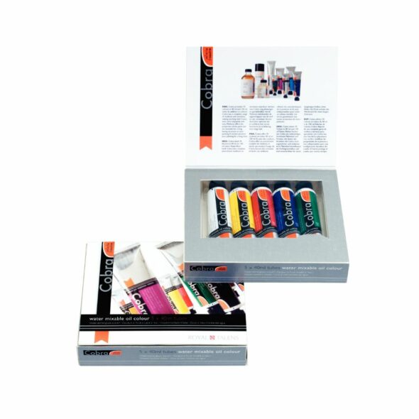 Cet ensemble pratique contient cinq couleurs de peintures à l’huile Cobra Artist dans des tubes de 40 ml : Blanc titane 105 – Jaune permanent 283 – Rouge pyrrole foncé 345 – Bleu de cobalt outremer 512 – Vert permanent foncé 619.