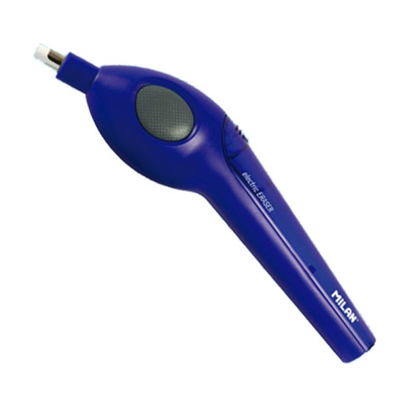 La marque MILAN propose une Gomme électrique ergonomique bleue dans un set complet.