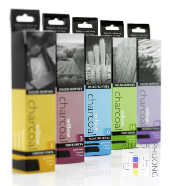DALER ROWNEY présente un Assortiment 10 fusains naturels d’une teinte noire profonde. Le diamètre varie de 2 à 10 mm.