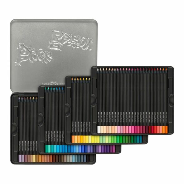 Disponible en boîte métallique de 100 crayons de couleurs.