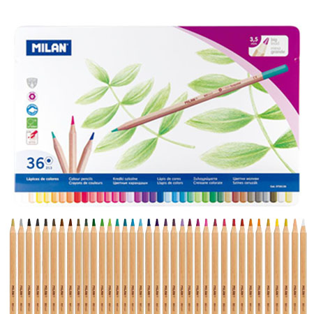 La Boîte de 36 crayons de couleur MILAN contient des crayons hexagonaux à grosse mine de 3,5 mm Ø. La mine offre un tracé uniforme et résiste aux cassures grâce au système LPS (Lead Protection System) qui protège la mine en adhérant au bois. Le bois provient de plantations durables.