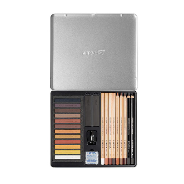 La Boîte de crayons esquisse Ton brun LYRA REMBRANDT est composé de 4 crayons secs aquarellables (blanc, sanguine, sépia clair, sépia foncé), 3 crayons gras (sanguine, sépia clair, sépia foncé), 2 crayons fusain aquarellables (2B, H), 12 carrés pastels aux tons bruns, 2 carrés fusain (HB, 2B), un taille-crayon et une gomme mie de pain.