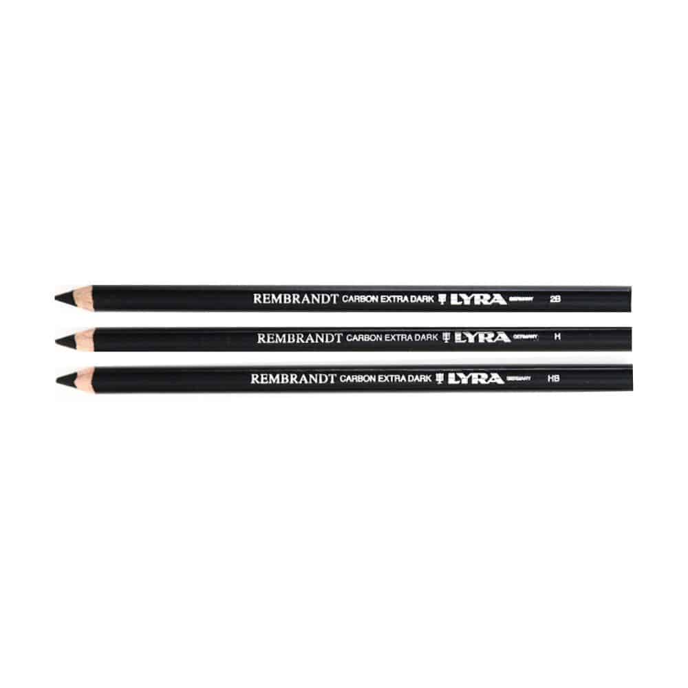 Le Crayon carbone extra noir Rembrandt, idéal pour créer de la profondeur, est disponible en plusieurs graduations pour un usage artistique : moyen, dur et extra dur.