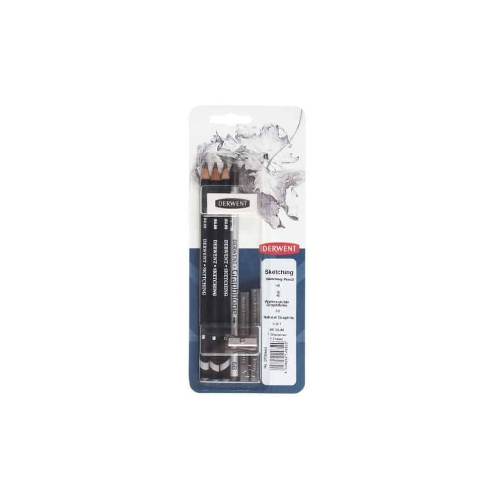 Ce set comprend un bâton de Graphitone hydrosoluble (6B), deux carrés de graphite (doux et moyen), trois crayons d’esquisse (4B, 2B, HB), une gomme et un taille-crayon. Ces outils de dessin et accessoires Derwent forment un excellent kit d’introduction à l’esquisse.