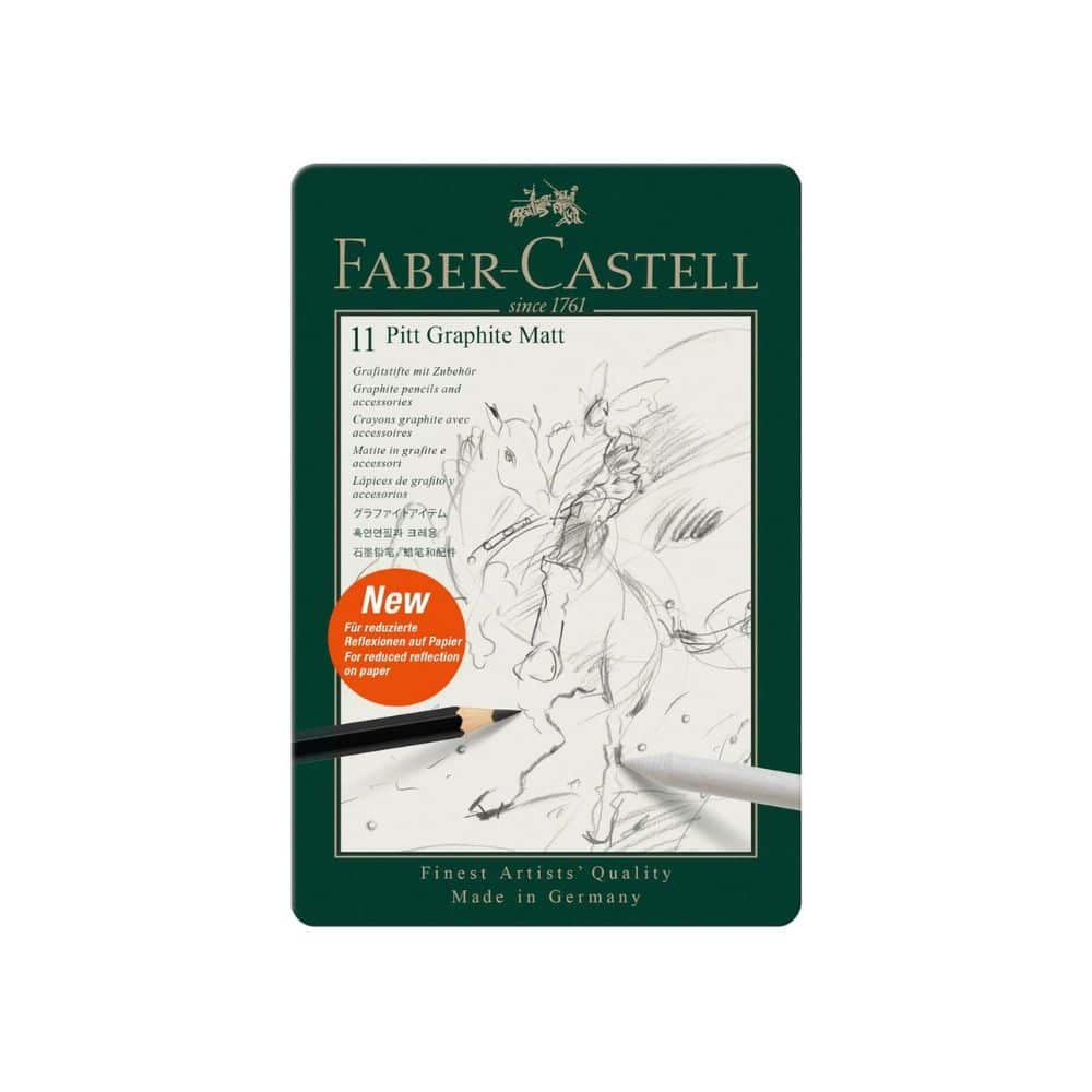 Cette boîte contient 8 crayons graphite Pitt Graphite Matt en HB, 2B, 4B, 6B, 8B, 10B, 12B, 14B 1 estompe 1 taille-crayon et une gomme.
